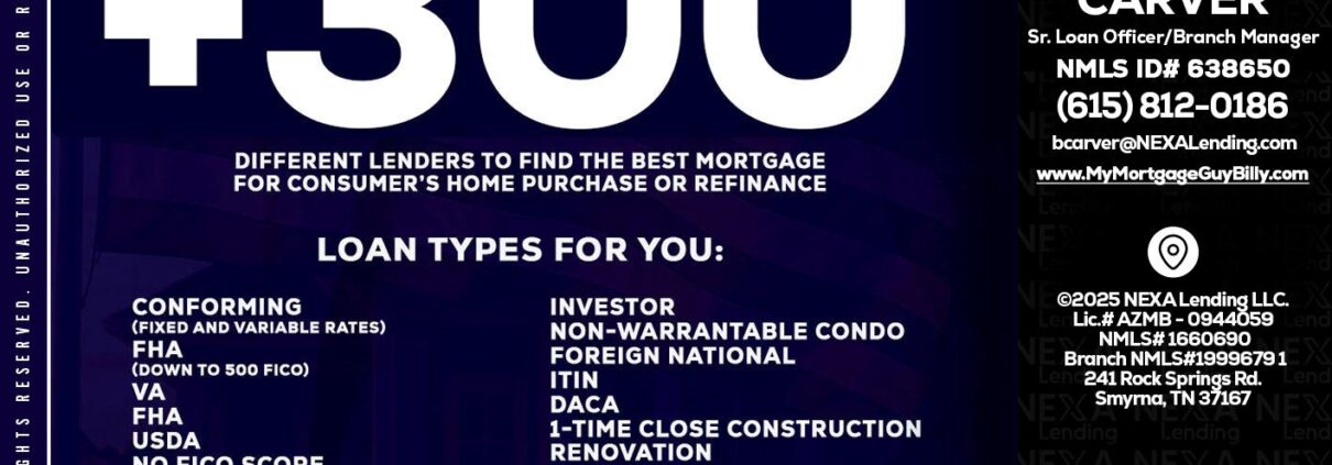 Hi, my name is Billy Carver. I’m a Loan Officer with NEXA Lending LLC., offering personalized mortgage solutions, fast customized quotes, great rates and service with integrity.
