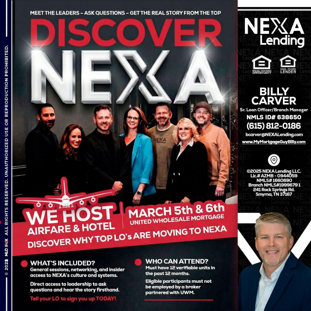 Hi, my name is Billy Carver. I’m a Loan Officer with NEXA Lending LLC., offering personalized mortgage solutions, fast customized quotes, great rates and service with integrity.