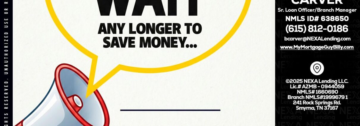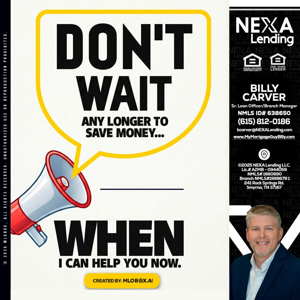 DONT WAIT - Billy Carver -Sr Loan Officer / Branch ManagerHi, my name is Billy Carver. I’m a Loan Officer with NEXA Lending LLC., offering personalized mortgage solutions, fast customized quotes, great rates and service with integrity.