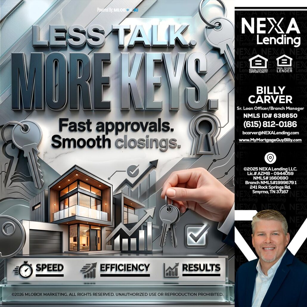 LESS TALK, MORE KEYS! - Billy Carver -Sr Loan Officer / Branch ManagerHello to all upcoming home owners in the making. Let me be the source for you to own the keys to your forever home, send me a message and let’s get your started in the home buying process. ..