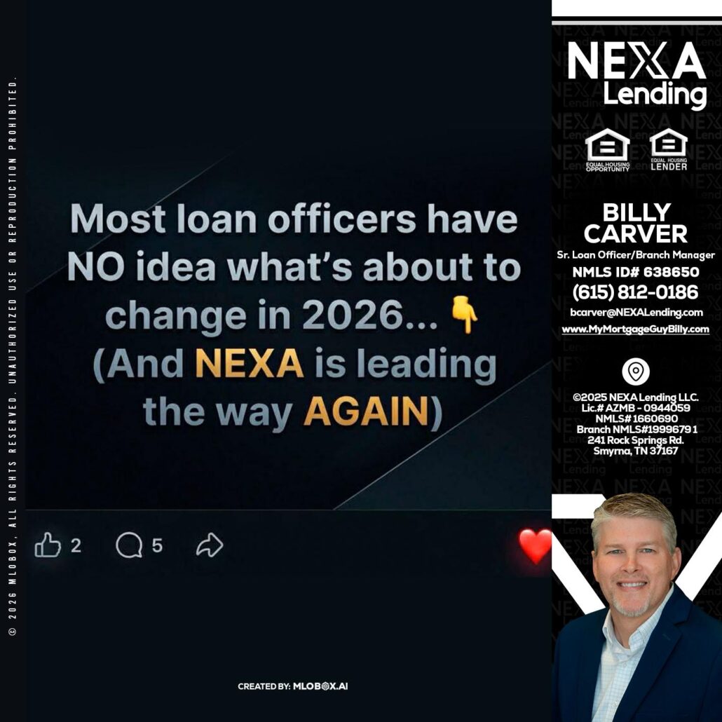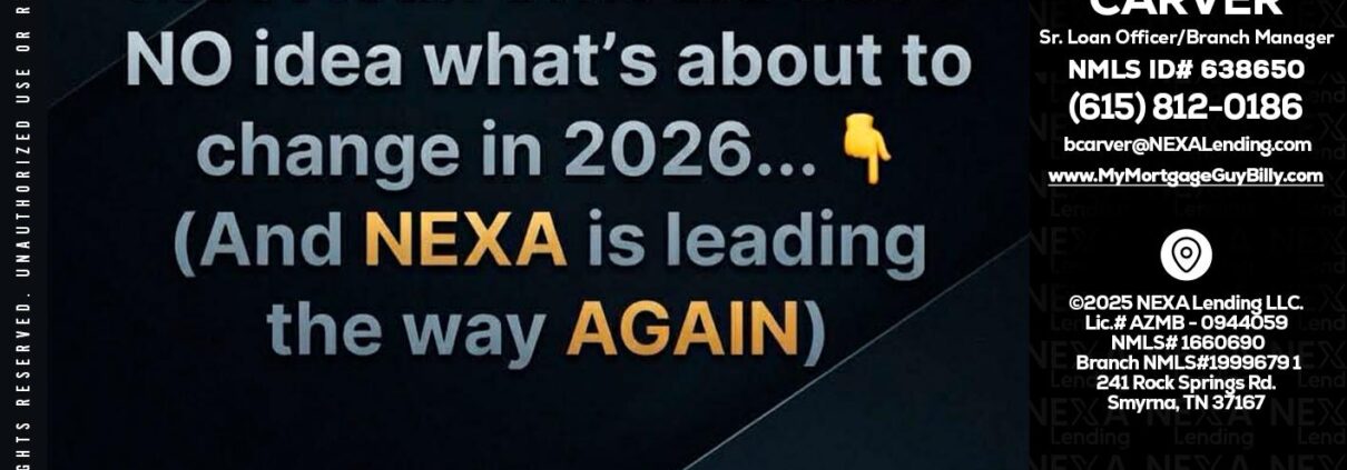 Hi, my name is Billy Carver. I’m a Loan Officer with NEXA Lending LLC., offering personalized mortgage solutions, fast customized quotes, great rates and service with integrity.