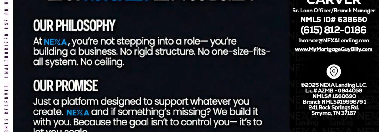 Hi, my name is Billy Carver. I’m a Loan Officer with NEXA Lending LLC., offering personalized mortgage solutions, fast customized quotes, great rates and service with integrity.