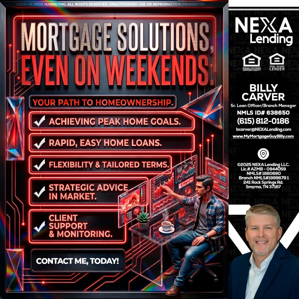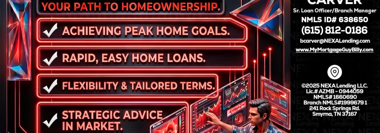 Hi, my name is Billy Carver. I’m a Loan Officer with NEXA Lending LLC., offering personalized mortgage solutions, fast customized quotes, great rates and service with integrity.